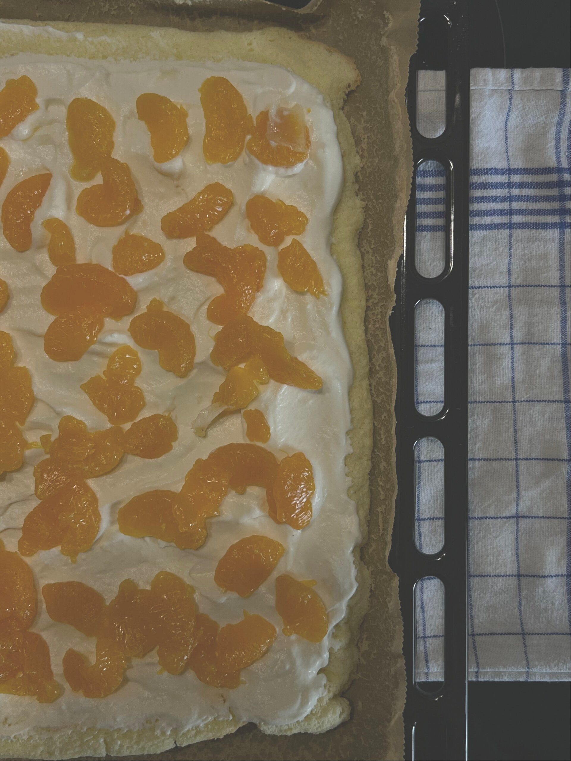 - In der Zwischenzeit: Die Schlagsahne mit dem Puderzucker und Sahnesteif steifschlagen und in den Kühlschrank stellen. Danach kannst du den Belag deiner Wahl in kleine Stückchen schneiden. Im Winter verwende ich gerne Dosenobst, z.B. Mandarinen, und im Sommer/Frühling frische Beeren wie z.B. Erdbeeren oder Himbeeren.
