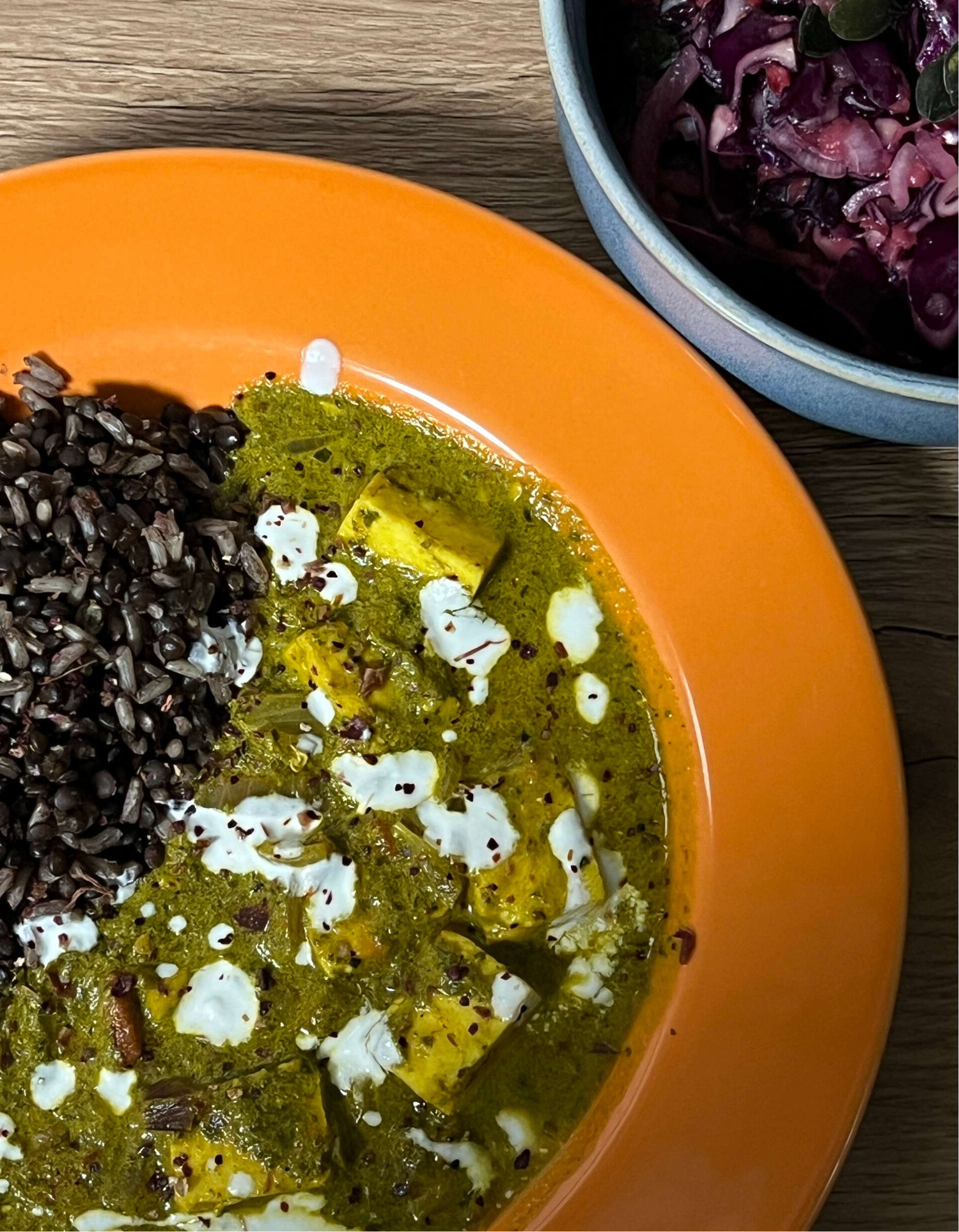 Serviere das Palak Paneer zusammen mit dem Reis. Nach Wunsch kannst du das Gericht noch mit frischem Koriander garnieren.