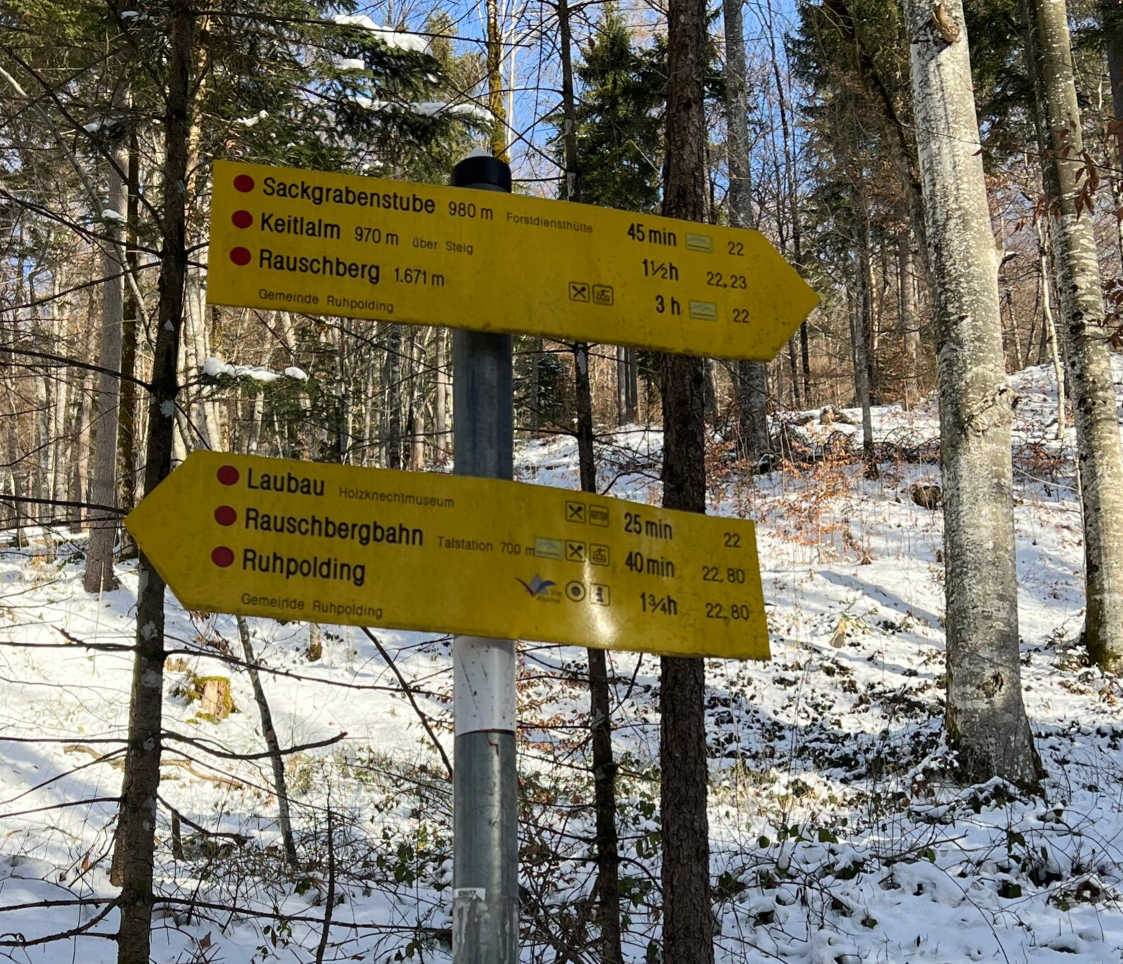 Die Zeichen auf den Schildern Richtung Rauschberg sind nicht mehr aktuell, die Gaststädte und die Seilbahn sind seit 2023 geschlossen. Dadurch ist die Strecke und der Gipfel überwiegend leer.
